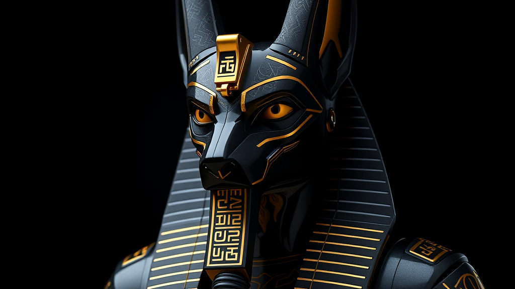 A futuristic reinterpretation of a masterpiece sculpture of Anubis, the "God of Death," showcasing an avant-Egyptian design. The monumental god figure is incredibly complex and exudes a futuristic aura. Sculpted from black granite with an ultra-smooth finish, it features exquisite gold inlays and modular, sacred hieroglyphs. Set against a dark background, Egyptian symbology is dimly projected onto the figure using light, adding to its grand and sober presence. The focus is on an intimate portrait shot, highlighting the laser-cut, hyper-detailed features of the sculpture. A sci-fi twist blends seamlessly with avant-Egyptian elements, presenting an innovatively styled Anubis.