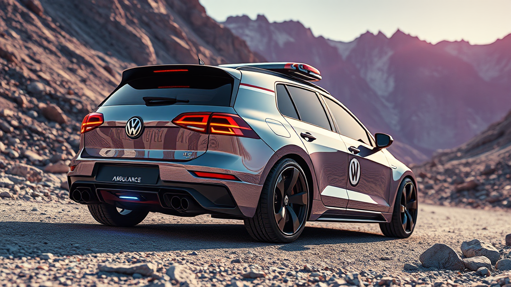 A futuristic robot-style VW Golf car with an ambulance insignia navigates through a rugged mountainous landscape, its metallic body reflecting the vibrant hues of neon sunlight. The panoramic scene captures the intricate details of the terrain, with the car's glossy, high-resolution finish glistening in the light, a testament to advanced technology and precision engineering.