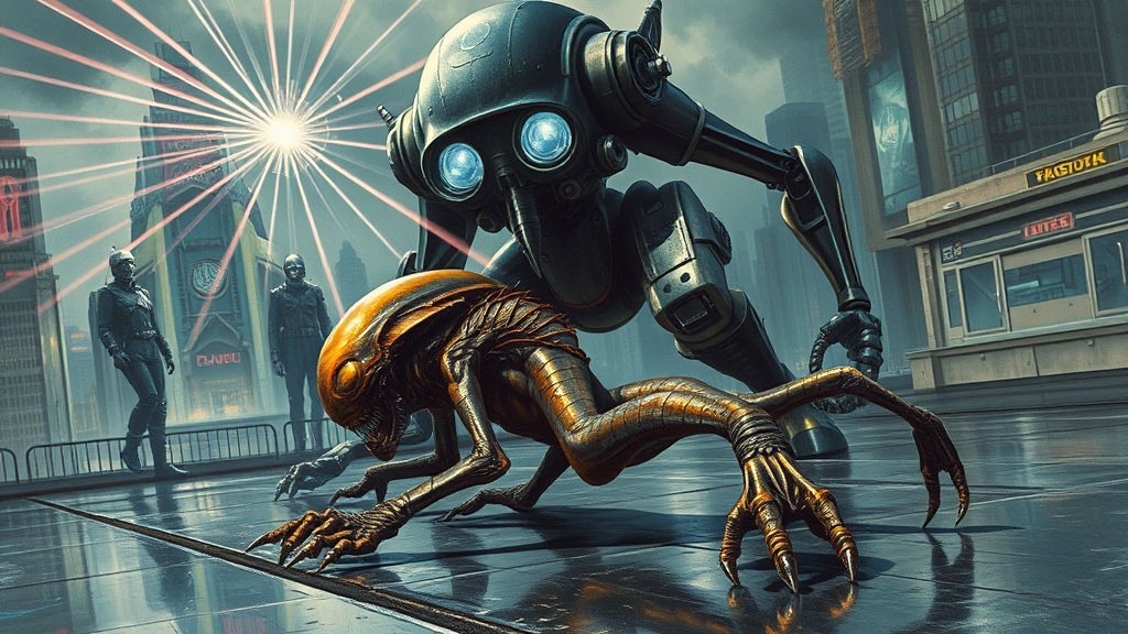 A futuristic robot unleashes a barrage of laser beams from its eyes, targeting an alien with iridescent skin being dragged across a metallic floor by its elongated limbs, against the backdrop of a dystopian cityscape, reminiscent of the dynamic and detailed art of Robert McGinnis and Frank Frazetta, capturing a blend of tension and otherworldly wonder with intense colors and dramatic lighting.