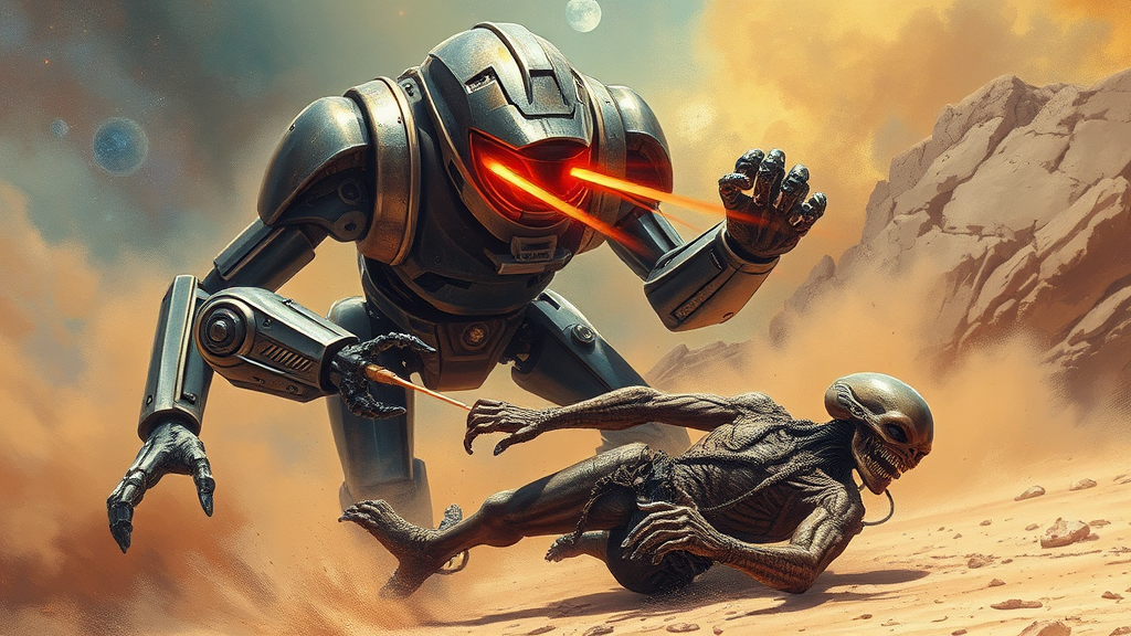 A futuristic robot with gleaming metal plates emits fiery laser beams from its eyes, targeting a menacing alien who is being dragged across the ground by powerful, unseen forces. The scene is a dramatic display of tension and energy, perfect for a science fiction book cover, capturing the bold, dynamic style reminiscent of Robert McGinnis and Frank Frazetta. The landscape is an otherworldly battleground, with swirling dust and vibrant cosmic colors enhancing the sense of epic conflict.