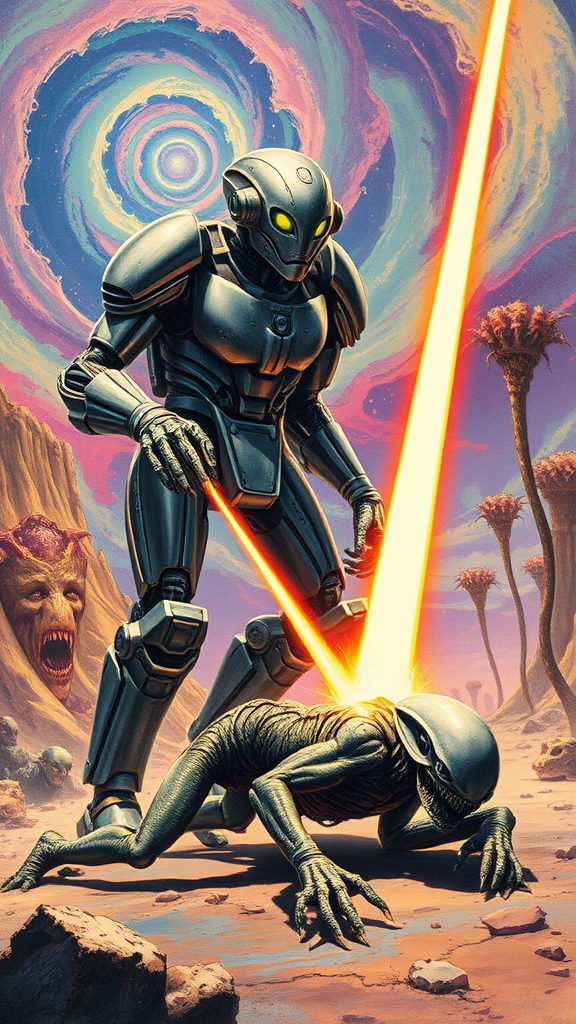 A futuristic robot with sleek metallic armor is emitting intense laser beams from its glowing eyes, aiming them at an alien being dragged across the ground by its elongated, scaly legs. The scene is set against a vivid, otherworldly landscape with swirling cosmic colors and towering alien flora. In the style reminiscent of Robert McGinnis and Frank Frazetta, the composition blends dynamic action with surreal elements, creating a visually striking and imaginative depiction for a science fiction book cover.