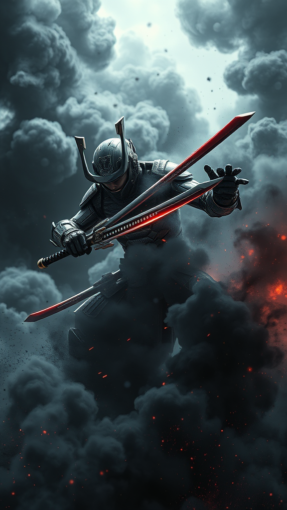 A futuristic samurai cyborg in dynamic motion, executing a powerful attack on adversaries amidst swirling jet-black smoke. The scene is infused with a vibrant explosion of colors against a backdrop of shadows, all captured with stunning detail. Atmospheric and hyper-realistic elements blend seamlessly with high-detail textures, while ray tracing techniques bring a cartoon-like vividness to the futuristic warrior and their environment.