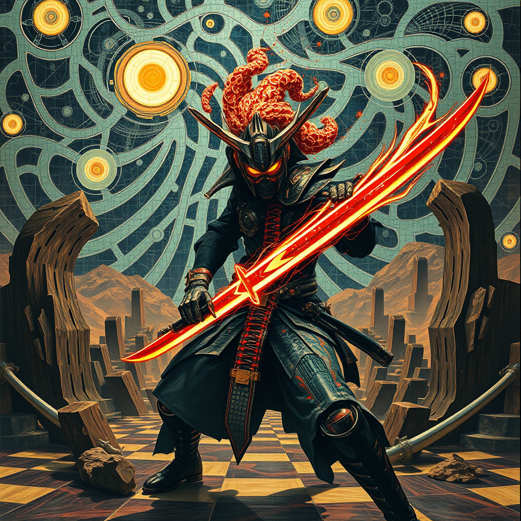 A futuristic samurai with a fragmented psyche wielding a glowing nuclear katana, surrounded by a surreal landscape of tessellated patterns and swirling AI-generated omens. In the backdrop, an intricate op art checkerboard forms an abstract mosaic that seems to pulse and shift, reflecting the samurai's inner turmoil. The scene is painted in the meticulous style of Jean Leon Gerome, with rich textures and dynamic contrasts.