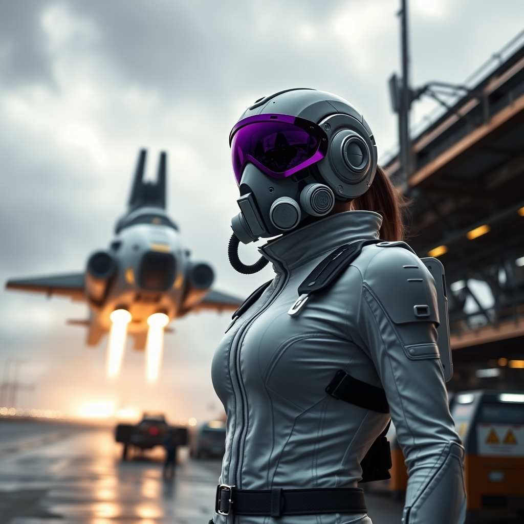 A futuristic scene depicts a female figure in a sleek white jumpsuit standing at a bustling spaceport, with a massive ship launching into the cloudy, overcast sky in the background. Her ensemble includes a striking purple sci-fi visor mask with intricate lenses and a sophisticated respirator, seamlessly integrated with exo-plate armor pieces that convey an authoritative presence. Positioned from a third-person perspective and viewed from below, this moment captures an aura of power and anticipation. The imagery showcases an abundance of fine detail true to sci-fi movie aesthetics, employing natural textures and lighting to achieve photorealism. The cinematic composition benefits from advanced rendering techniques like ray tracing, capturing an 8K ultra-HD quality that enhances the moody yet dynamic atmosphere. Notable for its cinematic lighting and the use of a subtle blur effect reminiscent of long exposure photography, the scene unfolds with natural light filtering through the expanse, enriching the visual storytelling with its realism and depth.