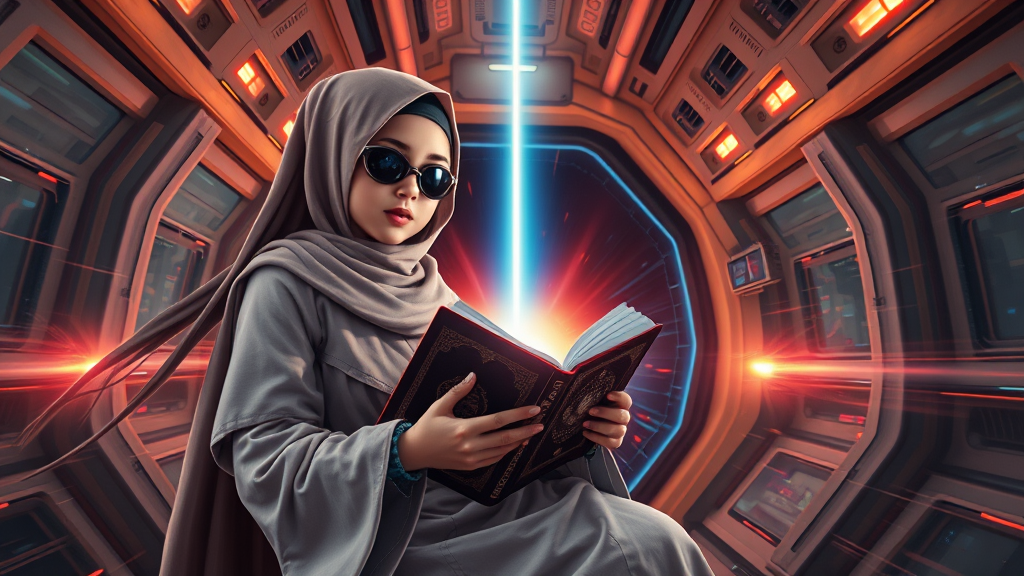 A futuristic scene featuring a cute hijabi girl with advanced cyberpunk prosthetics, holding a Quran. She dons a traditional Islamic dress, complemented by her long hair flowing amidst the spaceship's interior. The environment exudes a sci-fi aura, complete with photorealism and hyper realistic details. In the center, a powerful laser beam cuts through, originating from the sky, casting vibrant energy clots around. The scene captures a sense of acceleration and speed with dynamic light flashes, in a painted style that is 8K, HD, and super-resolution. The cinematic composition, characterized by long exposure and intricate details, immerses the viewer in a world of futuristic wonder.