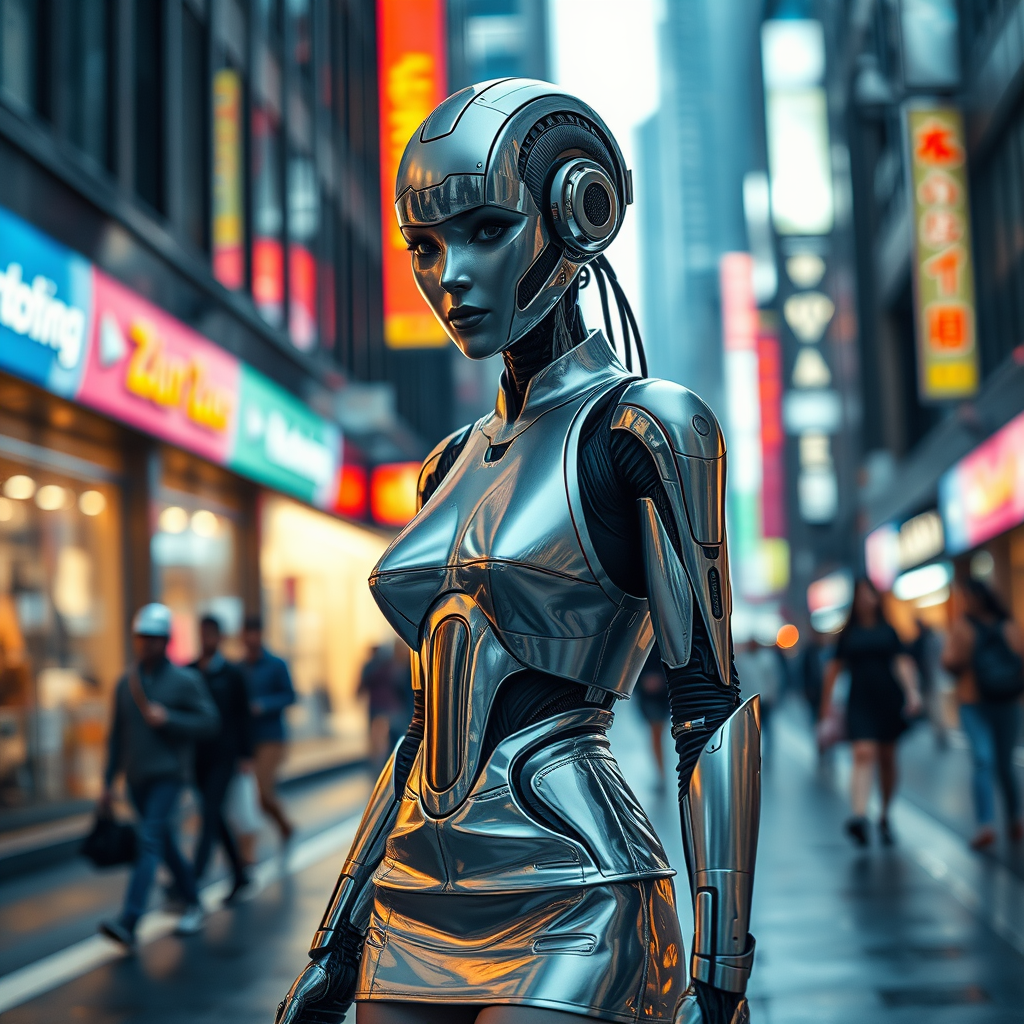 A futuristic scene featuring a cyborg with a sleek, shiny silver metal body walking confidently on a bustling city street, wearing a stylish mini skirt. The android's faceless design reflects the urban lights, while its piercing features draw the viewer in for a closer look. The image is captured in a portrait style, showcasing detailed, photo-realistic skin and intricate textures. The scene is brought to life with 8k clarity and high detail, utilizing diffused soft lighting and a shallow depth of field for a sharp, hyper-realistic focus. Cinematic lighting enhances the mood, creating a dynamic, immersive setting. Despite the hyperrealism, subtle artistic elements add a unique, creative twist, ensuring an intriguing visual narrative free from any imperfections such as artifacts or distortions.
