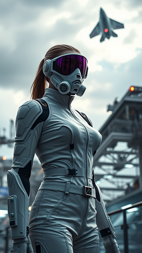 A futuristic scene featuring a female figure clad in a sleek, white jumpsuit, standing majestically at a bustling spaceport as a spaceship ascends dramatically in the overcast sky. Her face is partially obscured by a sophisticated sci-fi visor mask with a purple tint, intricately designed sci-fi lenses, and a high-tech respirator. Her attire boasts a blend of sleek plate armor and isolated armor pieces, creating a striking silhouette in the lower perspective. The image captures immense detail akin to a sci-fi movie, with natural textures and lighting adding to the photorealistic quality. Cinematic elements like ray tracing and moody lighting enhance the scene's atmosphere, while strategic blur and long exposure bring motion to life in 8K Ultra-HD clarity. The portrayal is devoid of any anatomical inconsistencies, maintaining harmony between realism and artistic creativity, in a high-quality CGI render that highlights a seamless blend of tradition and futuristic design.