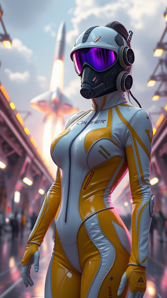 A futuristic scene featuring a female figure in a form-fitting white and yellow jumpsuit with intricate detailing, standing in a bustling spaceport as a sleek spaceship launches into the sky behind her. She wears a sophisticated mask and a vibrant purple sci-fi visor, complete with cutting-edge lenses and a respirator, exuding a sense of mystery and advanced technology. The setting is a visual masterpiece trending on art platforms, embodying extreme detail and cinematic quality. The environment is stunning, with shiny surfaces, smooth textures, and a surreal, divine atmosphere infused with manga and anime influences. Vivid colors and intricate details abound, illuminated by dramatic, hyperrealistic lighting that showcases unreal engine 5's lumen reflections and cgi prowess. The 3d rendering is doll-like yet retains a sense of authenticity through octane render technology. The image is intentional and well-crafted, avoiding common visual pitfalls like poor anatomy, disfigurement, or cloning, resulting in a perfect blend of beauty and sci-fi intrigue.