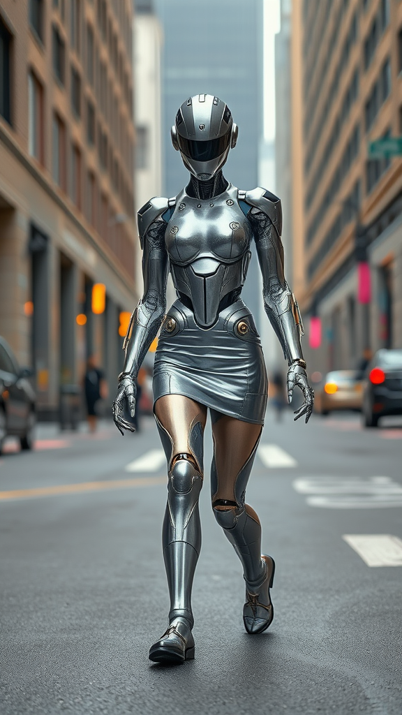 A futuristic scene featuring a robot cyborg with an android-like appearance, boasting a faceless, shiny silver metal body contrasted with a stylish mini skirt. This figure strides confidently down a city street, framed by an urban backdrop. The subject engages directly with the viewer in a portrait-style composition. The photography captures detailed, realistic textures and intricate skin nuances, presented in an 8k hyper-realistic resolution. The full-length frame showcases high-detail RAW colors, while soft, diffused lighting combined with a shallow depth of field creates a cinematic ambiance. Despite the sharp focus, elements of error and imperfection surface: low resolution, text glitches, and visual artifacts complement a haunting, surreal aesthetic with distorted anatomy and proportions, drawing attention to unusually fused or extra limbs, and subtle deformities that evoke a sense of mutated allure. The composition resonates with an intentional, artistically morbid distortion, emphasizing a unique narrative hidden in low quality, reminiscent of the imperfect beauty within digitally corrupted imagery.