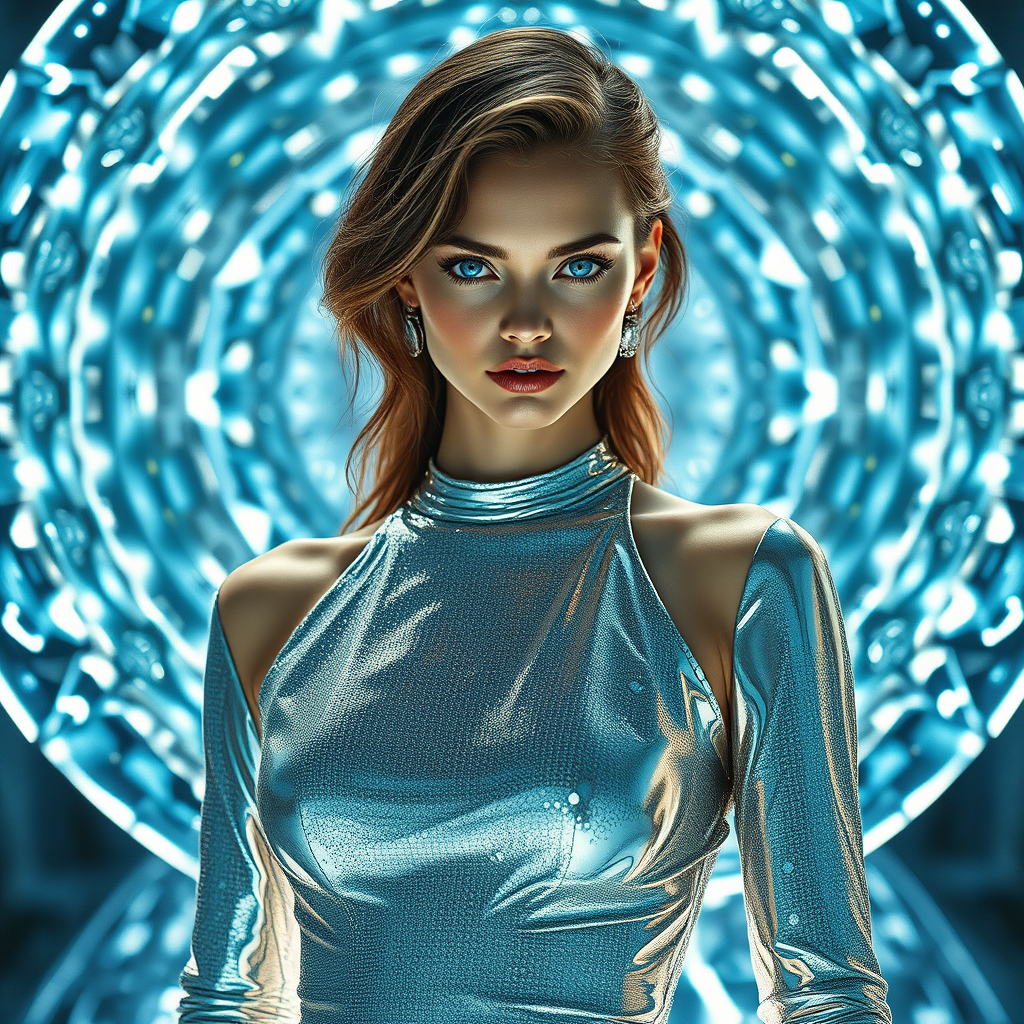 A futuristic scene featuring a woman in a shimmering silver dress, her bright blue eyes radiating a captivating glow. She stands confidently, striking a pose that captures both elegance and strength, echoing the high fashion aesthetic of a Dior campaign. Her presence is illuminated by the kaleidoscopic reflections of a hovering tesseract, casting intricate patterns around her. With elements of futurism and digital artistry reminiscent of trending CG society pieces, the composition draws inspiration from supermodel vibes akin to Miranda Kerr's allure, set against a 3:4 visual frame that emphasizes her poised form.