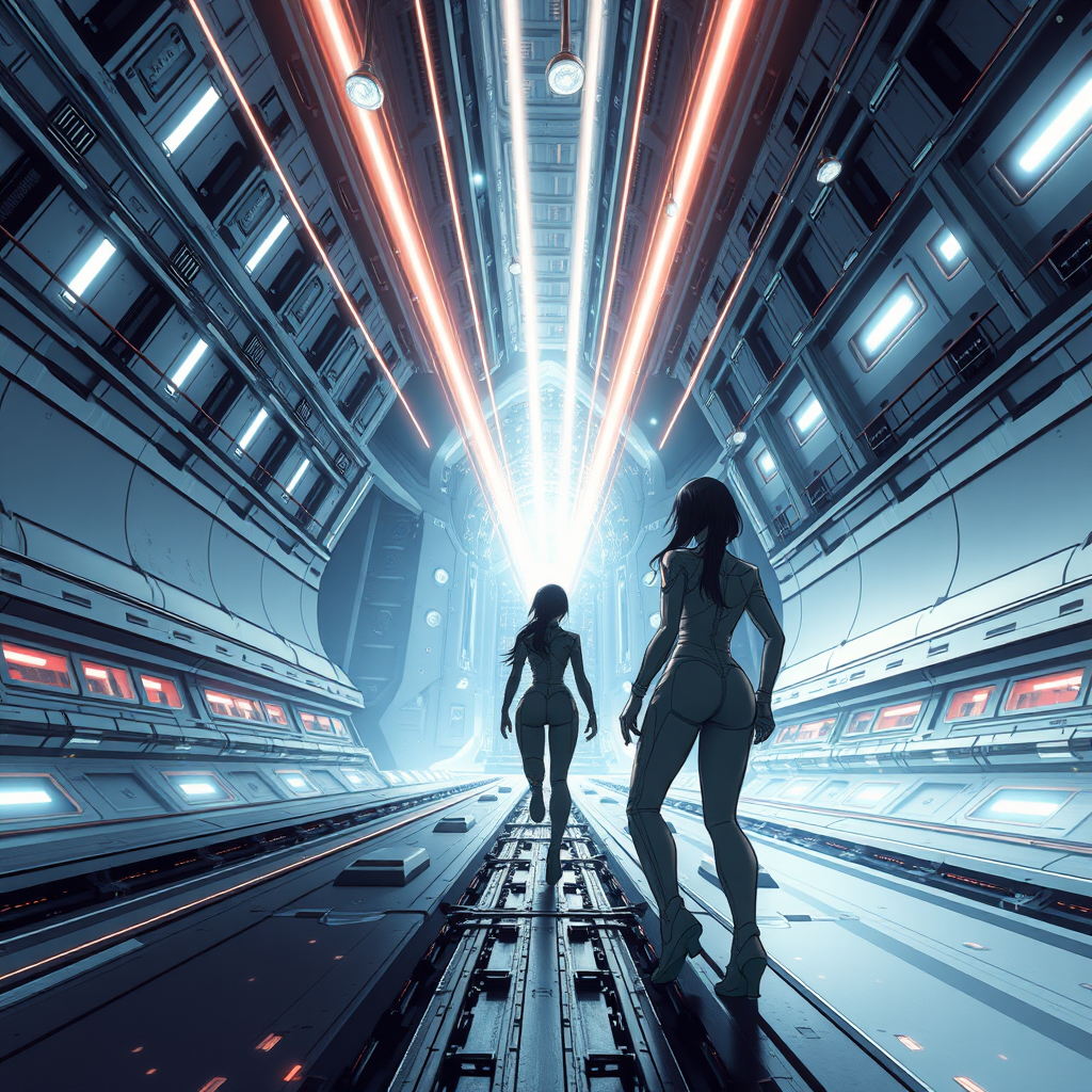 A futuristic scene featuring a young woman in a form-fitting jumpsuit, positioned within the vast interior of a sleek spaceship, designed in the style reminiscent of Tsutomu Nihei's work, like Sidonia no Kishi. The environment conveys a sense of grand scale with multi-story dimensions, exhibiting gigantism in its structure. At the center, a powerful laser generator emits beams that pierce the space, interacting with energy clots suspended in the air. These lasers shoot from above, creating flashes of light and conveying a sense of rapid acceleration and speed. The scene is highly detailed, capturing the intricate anime and manga art style in super-resolution 8K, with a focus on hyper-detailed graphics that enhance the sci-fi atmosphere. The perspective is dynamic and immersive, offering a first-person view that encapsulates the intense energy and futuristic setting of this imaginative world.