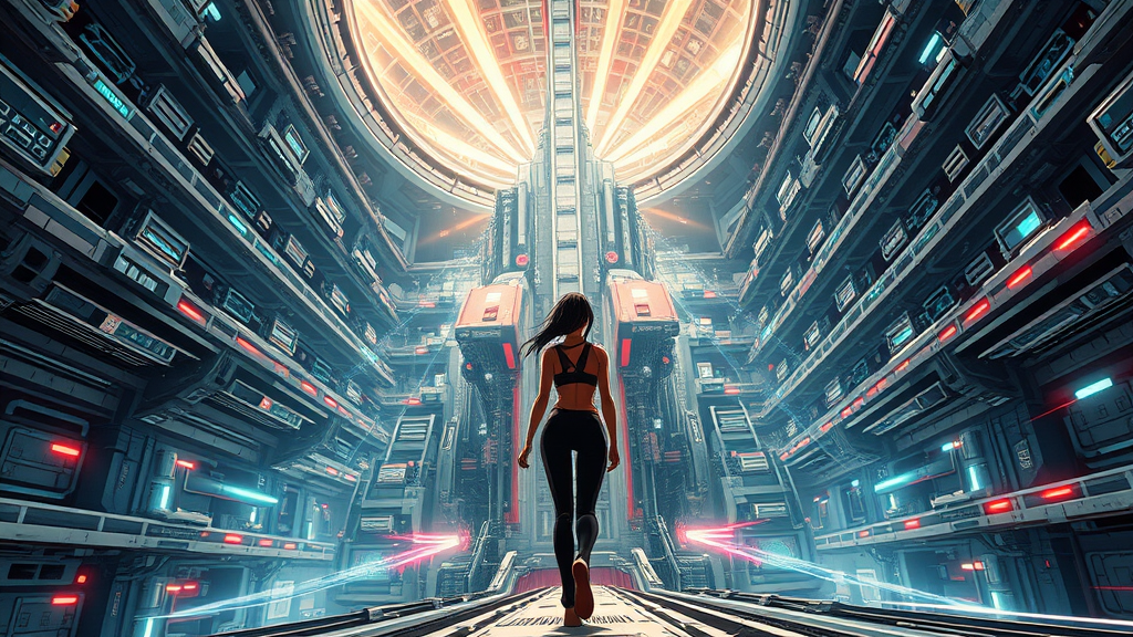 A futuristic scene inspired by Tsutomu Nihei's style featuring a girl in a sleek, form-fitting jumpsuit navigating through the interior of a colossal spaceship. The environment showcases a combination of multi-story spaces and intricate machinery, with a prominent laser generator at the center, emitting beams that stretch toward the sky. The setting is filled with an intense energy, with clots of power surging and casting flashes of light. This seamless blend of gigantism and acceleration captures the essence of a dynamic sci-fi world. The hyperdetailed imagery and high-definition resolution bring out manga-like graphics in an anime drawing style, emphasizing speed and vibrant motion within the expansive, futuristic domain.