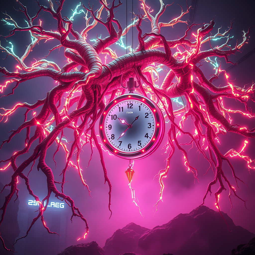 A futuristic scene where glowing, neon-infused dragon tree roots intricately weave around a suspended, ethereal clock. The vibrant roots pulsate with energy, creating a surreal cyberpunk atmosphere in a dark, misty environment, casting luminescent hues that dance across the clock's surface, ticking slowly through time.