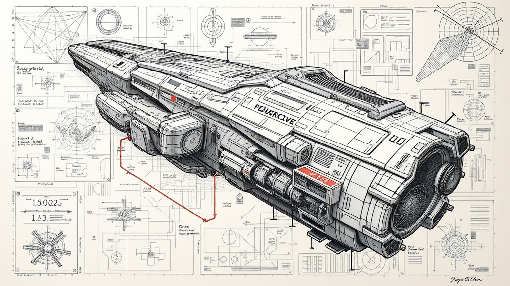 A futuristic sci-fi massive spacecraft sketch featuring detailed blueprints, warp engines, complex formulas, and annotations. The design is divided into schematic parts, incorporating the golden ratio for aesthetic balance, with intricate and imaginative fake details. This artwork is trending on Pixiv Fanbox, utilizing bold and dynamic strokes with an acrylic palette knife. It combines the evocative storytelling and emotional depth of Makoto Shinkai, the whimsical charm of Studio Ghibli, the vibrant world-building of Genshin Impact, the minimalist elegance of James Gilleard, the fantastical elements of Greg Rutkowski, and the surreal beauty of Chiho Aoshima. The composition is visually striking, teeming with creative embellishments and layers of detail, offering a captivating vision of a not-so-distant future.