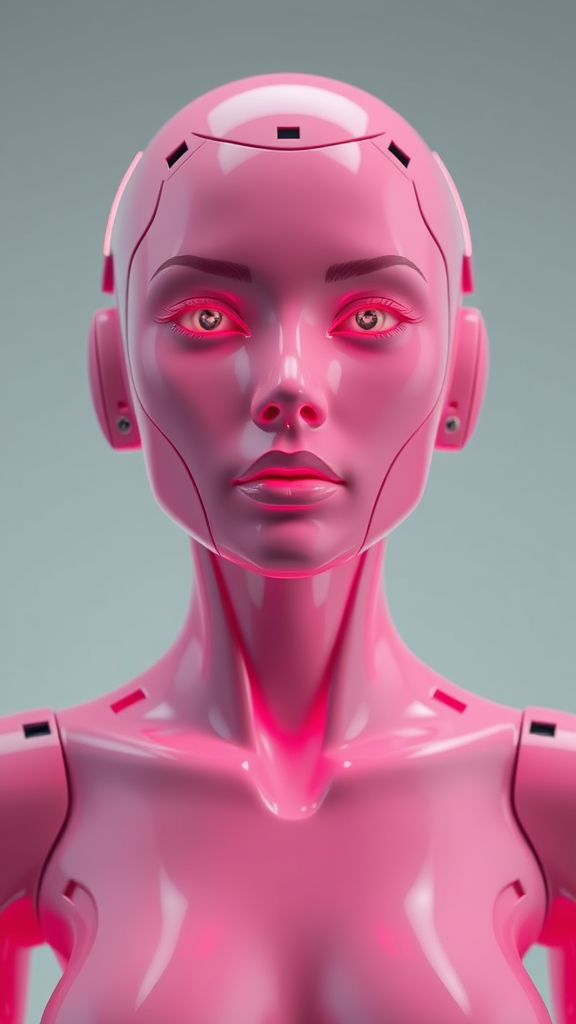 A futuristic sculpture depicting a woman with a bionic ceramic face in a glossy pink hue, appearing to emerge from the background. The front view is brightly illuminated, showcasing an ultra-realistic style with elements of modern minimalism. The design captures a sense of futuristic elegance and innovation.