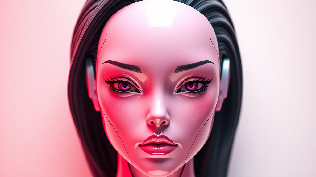 A futuristic sculpture featuring a woman with a bionic, glossy ceramic face in a sophisticated shade of pink, artistically set against a contrasting background. The piece is front-facing, basked in vibrant lighting to enhance ultra-realistic details. The design embraces modern minimalism with subtle futuristic elements, emphasizing sleek, clean lines and a polished aesthetic. Capturing the essence of advanced technology and artistic innovation, this sculpture stands as a testament to the harmony between human and machine in contemporary art.