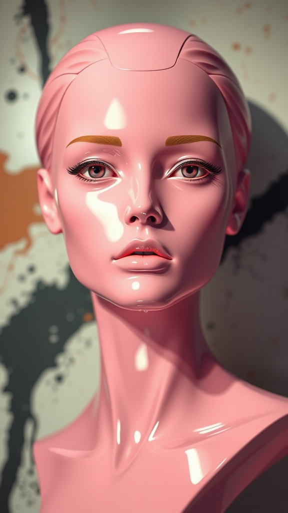 A futuristic sculpture of a woman with a bionic aesthetic, featuring a glossy pink ceramic face. The figure is prominently displayed, emerging from an abstract background, and illuminated brightly to highlight ultra-realistic details. The design embraces modern minimalism with a hint of avant-garde flair, emphasizing smooth contours and a striking interplay of light and shadow, capturing a vision of advanced technology and contemporary art.