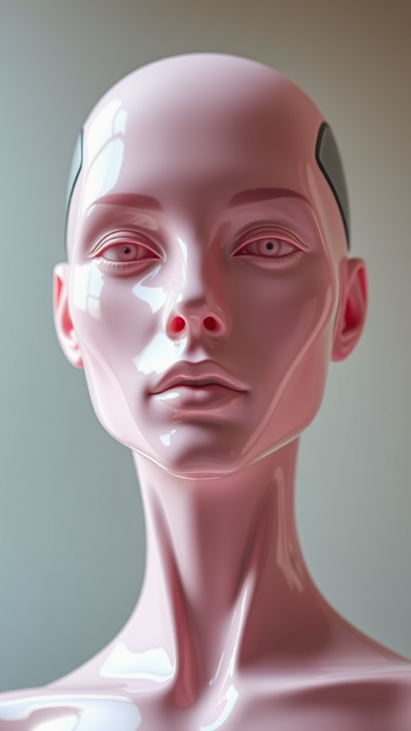 A futuristic sculpture of a woman with a bionic ceramic face, featuring a glossy pink finish, stands out dramatically from the background. Captured from a front view, the sculpture is brightly lit, showcasing its ultra-realistic features. The design embodies modern minimalism with subtle futuristic elements, emphasizing smooth lines and intricate details. Its aesthetic is sleek and striking, with an elongated aspect ratio that enhances its dynamic presence, presenting a vision that blends technology and art seamlessly.