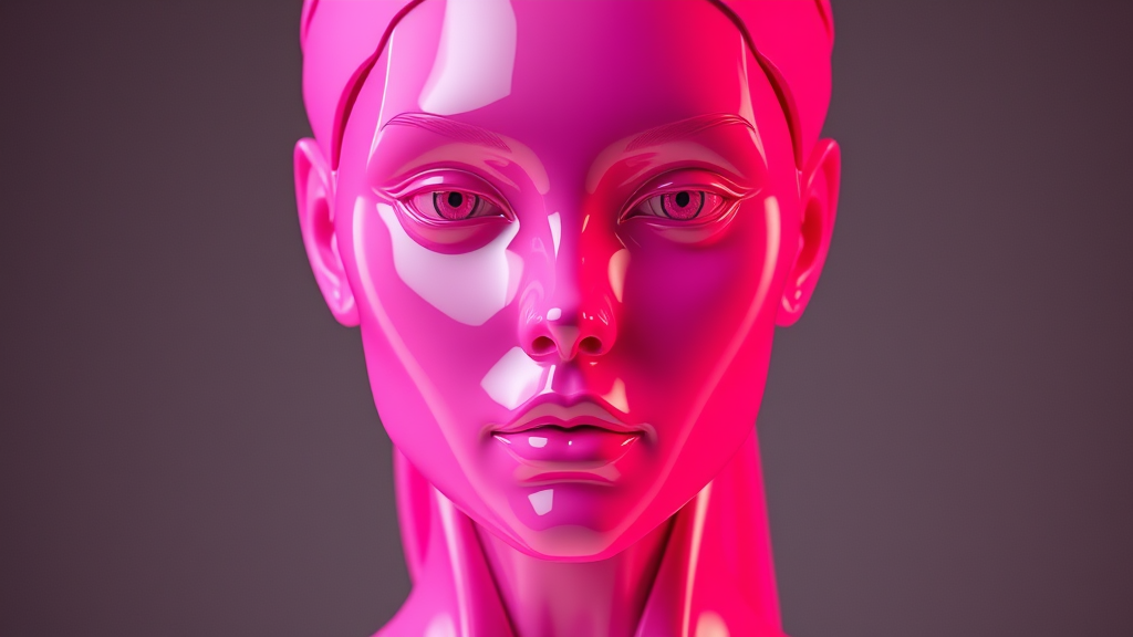 A futuristic sculpture of a woman with a bionic, glossy ceramic face in a vivid pink hue, appears to emerge from the background. The front view captures a brightly lit, ultra-realistic appearance with a touch of modern minimalism. Sleek and cutting-edge, this artwork embodies a vision of the future in a 3:4 aspect ratio, blending raw artistic style with a subtly enhanced setting for visual impact.