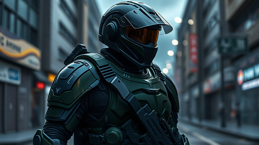 A futuristic soldier clad in sleek and advanced armor, showcasing state-of-the-art weaponry and a high-tech helmet, the ensemble in a dark army green hue. The soldier stands in an urban setting, the backdrop of a dimly lit street under an overcast sky. Reflection mapping enhances the intricate design and detailed craftsmanship of the armor, with dramatic lighting accentuating the hyperrealism of the scene. The visual is intensely photorealistic, reminiscent of a cinematic experience, rendered in breathtaking 8k resolution, akin to the power of unreal engine, presenting a vision of futuristic warfare in stunning detail.