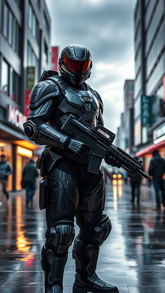 A futuristic soldier stands confidently on a bustling urban street, clad in sleek, hi-tech armor that glistens under the dramatic overcast sky. The soldier's armor is intricately designed, featuring mesmerizing patterns and minute details that catch the eye. Advanced weaponry rests securely in their grasp, emanating a sense of raw power and cutting-edge technology. Holographic navigation displays flicker and project from their wrist, casting a soft, ambient glow onto their gear. Reflections shimmer across rain-slicked surfaces, creating a symphony of light and realism that dances around them. The scene is rendered in hyperrealistic, photorealistic detail with cinematic flair, bringing to life the gritty yet stunningly beautiful environment. The entire composition is captured in breathtaking 8k, utilizing the power of an advanced engine to produce a vision of the future that is both awe-inspiring and eerily tangible.