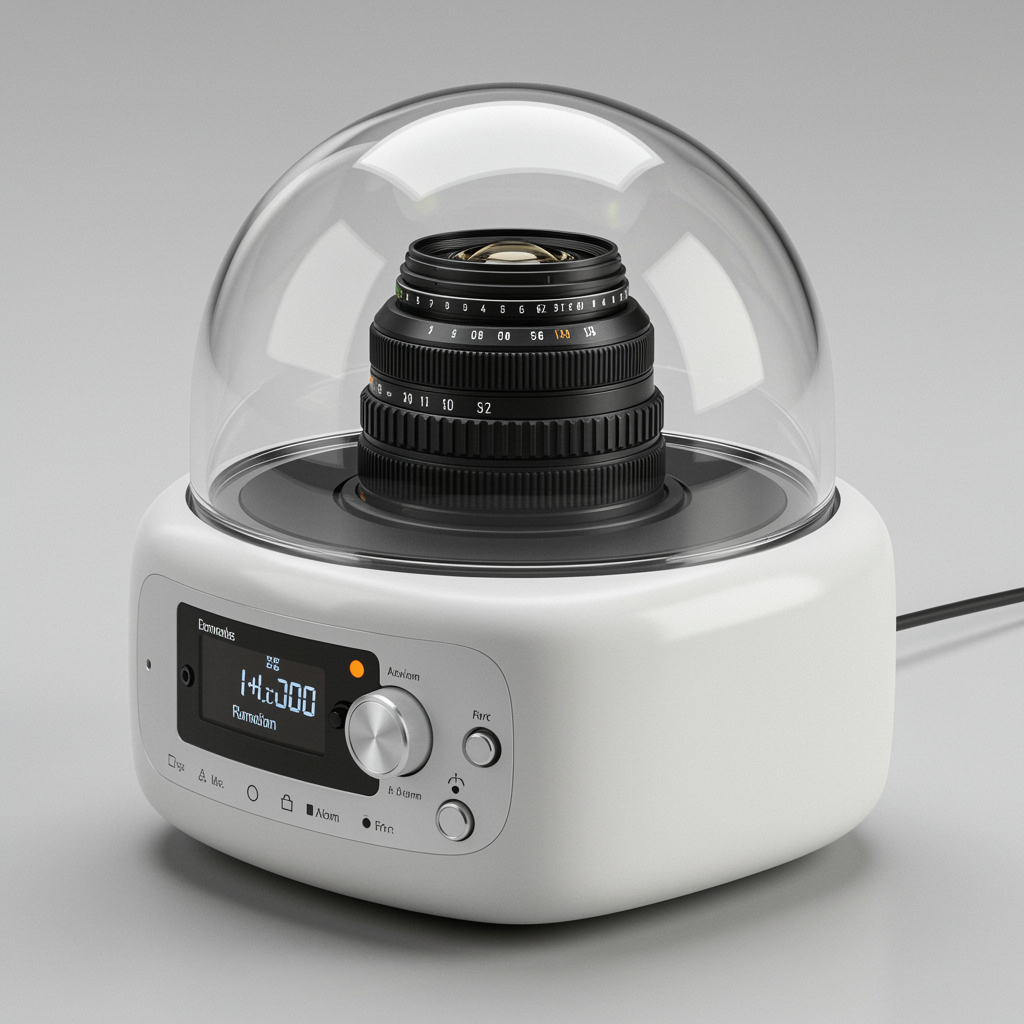 A futuristic sound system inspired by Dieter Rams' iconic minimalist design, featuring a sleek, transparent dome covering a digital control panel with elements of the Nikon Z9's precision and a lens-like rotatable dial reminiscent of the NIKKOR Z 50mm lens, all set against a contrasting pearl white background that evokes the timeless elegance of Snow White.