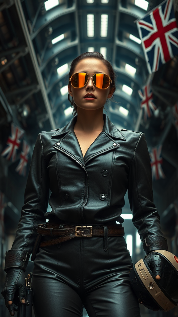 A futuristic spacecraft hangar houses a heroic female mechanic, adorned in an intricately detailed formal Oak Cool Pewter leather uniform. Her attire complements a cyberpunk aesthetic, complete with medals and a utility belt. Dramatic cinematic lighting accentuates her dynamic action posture, captured from a low angle shot. Her golden pilot sunglasses shimmer against the backdrop, emphasizing the highest facial details in this masterpiece, rendered in 8k. The environment features realistic fabric details and folds on her uniform, set against a simple background that highlights her presence. She is surrounded by tools, and a helmet rests nearby. The scene is punctuated by flags, including the Union Jack, adding a touch of realism to this dark, futuristic setting.
