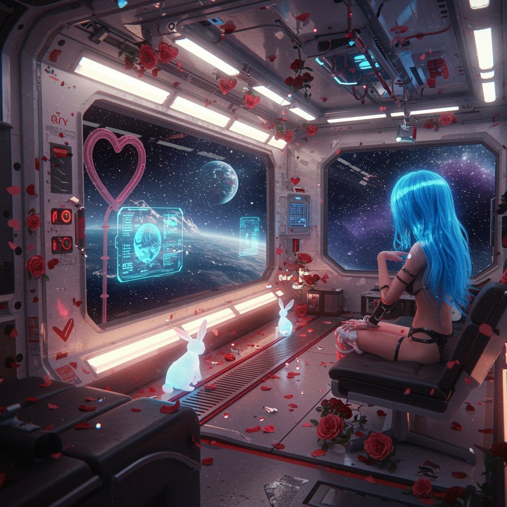A futuristic spacecraft with heart-shaped decorations and roses adorns its sleek design. Transparent walls provide an unobstructed view of the galaxy, showcasing stars and far-off planets against alien landscapes. Inside, holographic displays and advanced technology create a warm, cozy atmosphere. Cybernetic implants are subtly integrated into the environment, enhancing its modern feel. Adorable rabbits playfully wander through the space, adding a touch of whimsy. A beautiful girl with radiant blue hair, not wearing a space uniform, basks in cinematic light. The ambiance is romantic and inviting, captured in hyper-realistic detail using 8k resolution and 35mm f1.4 Fuji color film.