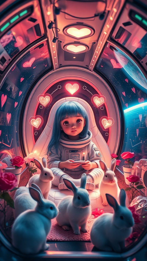 A futuristic spacecraft with transparent walls showcases heart-shaped decorations and roses, adorned with a sleek design that offers an unobstructed view of the stars and galaxy. A holographic display beams warmth and playfulness into the cozy interior, while cybernetic implants enhance the experience of traveling past far-off planets and alien landscapes. An adorable girl with blue hair sits, her beauty radiant in cinematic light, surrounded by rabbits hopping about the cabin. The atmosphere is romantic and advanced, with 8k hyper-realistic detail captured through a 35mm f1. 4 lens, reminiscent of Fuji color film. The scene is set without the confinements of a space uniform, evoking a sense of freedom and marvel at the harmonious blend of technology and nature.