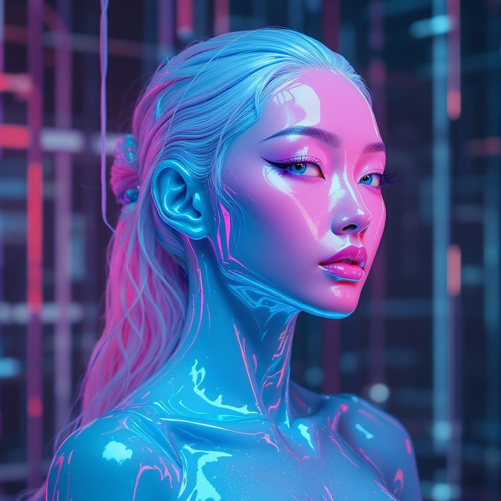 A futuristic three-quarter portrait featuring a blue body with a pink face, enveloped in iridescent fluids, showcases a hyper-realistic and photorealistic depiction. The scene is infused with a sci-fi aesthetic and Asian-inspired elements. The image is bathed in soft white and pink light, with a glossy, shiny finish that highlights the meticulous details. The composition embodies an aurorapunk style, offering a surreal yet lifelike representation that captivates with its intricate, luminescent textures.