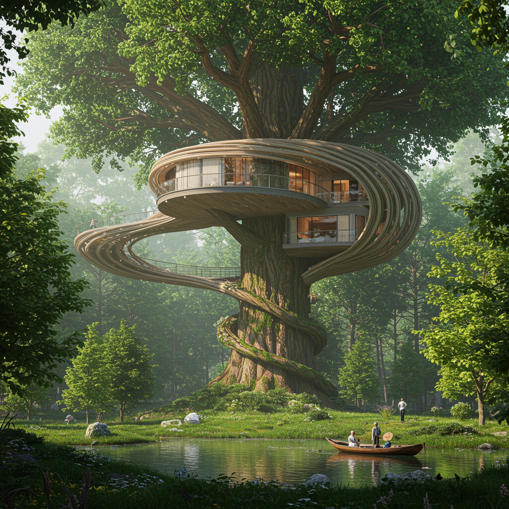 A futuristic tree house designed by a renowned German architect nestled in a colossal tree beside shimmering waters in a breathtakingly lush green forest, featuring intricate and mesmerizing details; the beauty of this structure is unimaginable. Influenced by the styles of Filip Hodas and Bo Bartlett, this hyper-realistic creation showcases organic minimalism in an 8k UHD setting. The scene captures a harmonious blend of nature and innovative architecture.