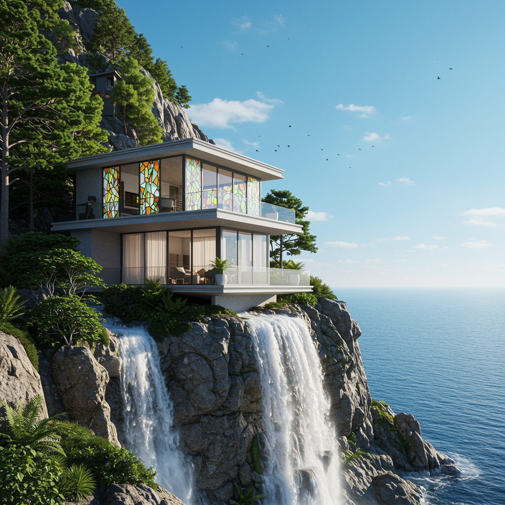A futuristic, ultra-modern residential module featuring expansive floor-to-ceiling windows and intricately designed stained-glass panels, perched majestically on a rugged stone cliff overlooking the shimmering ocean. The scene captures a perfect day with a clear blue sky and a gentle breeze rustling through the surrounding lush greenery. A stunning waterfall cascades down the cliff face, adding a serene ambiance. The high-quality 3D rendering showcases hyper-realistic details, blending seamlessly with nature, creating a harmonious and picturesque escape.