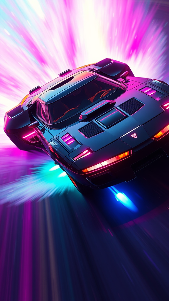 A futuristic vehicle resembling Kitt from Knight Rider, infused with speed-of-light capabilities, hyperdrive engines, and emitting a vibrant, neon glow. It moves through an extreme rainbow stream, leaving a trail of luminous colors. The scene is captured with intricate detail and cinematic lighting, highlighting the sleek design and dynamic motion.