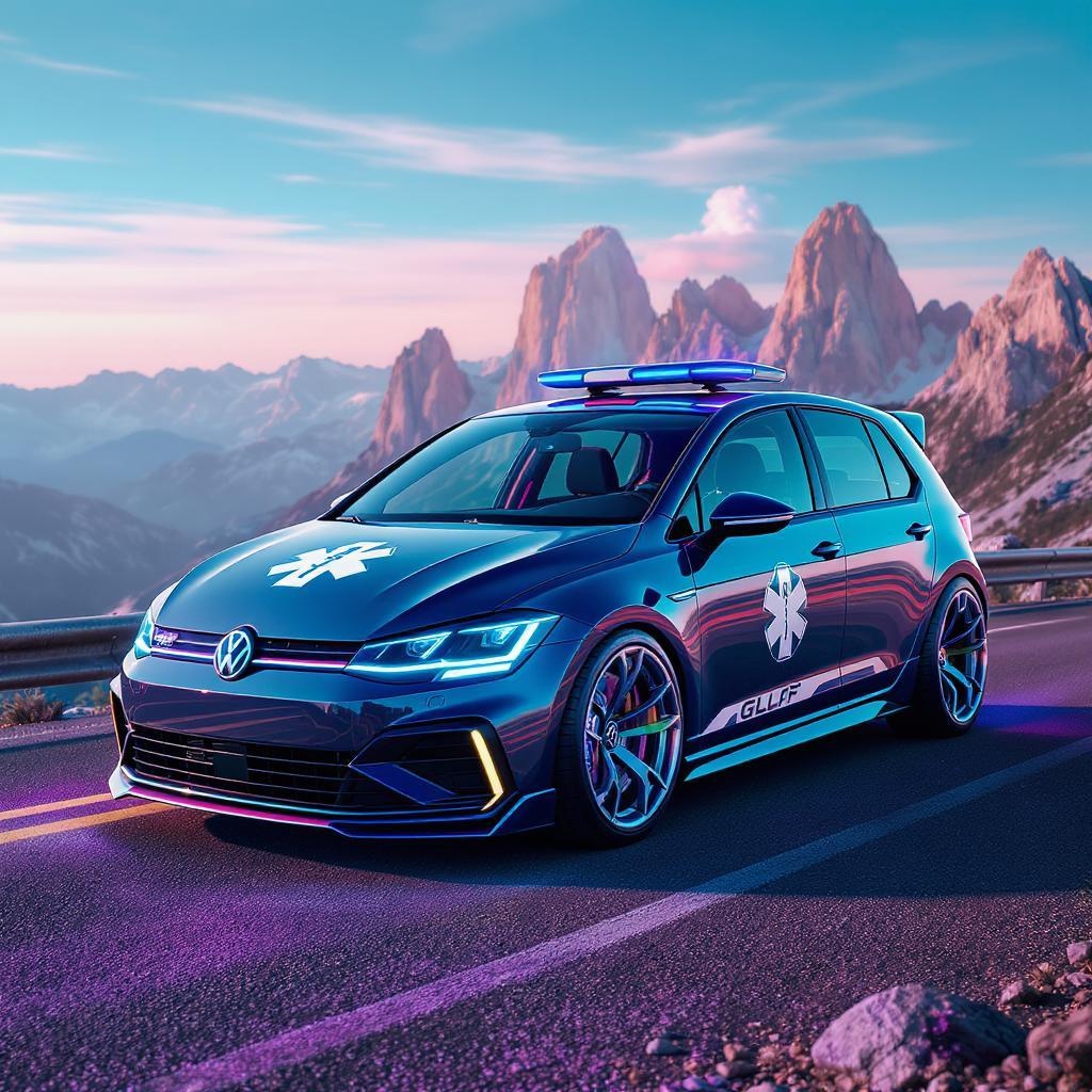 A futuristic VW Golf car designed in a robotic style, featuring an ambulance emblem, placed amidst a serene mountainous landscape bathed in vibrant neon hues and warm sunlight. The car has a sleek metallic finish, reflecting the surroundings with exceptional clarity and detail, captured in high resolution, giving it an 8k quality. Instead of a regular road, it’s perched on a scenic viewpoint, with panoramic views of jagged peaks in the background, adding a sense of adventure and modernity to the scene.