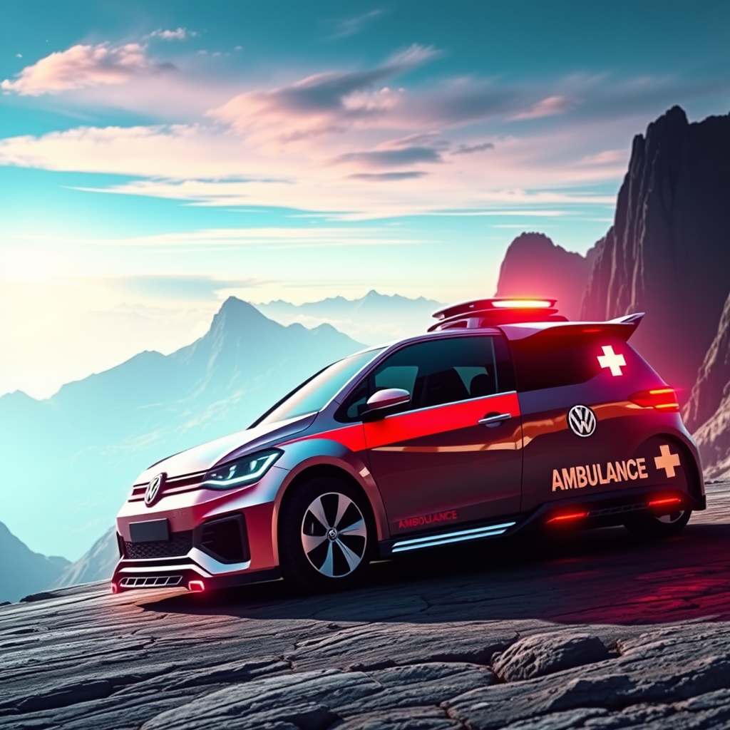 A futuristic VW Golf car designed in a sleek robot style, featuring an illuminated ambulance symbol, is set against a breathtaking mountainous landscape. The scene is bathed in vibrant neon hues, with rays of sunlight casting dynamic shadows. The car's metallic exterior glistens, showcasing intricate detailing in high resolution as the panoramic view unfolds in stunning 8k clarity. Bright accents highlight the advanced technology, blending harmoniously with the natural surroundings, creating a visionary and captivating tableau.