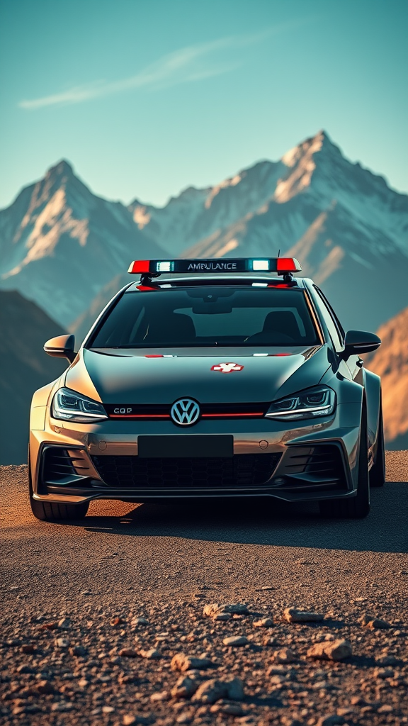 A futuristic VW Golf car designed in a sophisticated robot style, adorned with an ambulance emblem, set against a breathtaking mountainous landscape. Neon accents illuminate its sleek, metallic surface, while the sunlight casts dynamic reflections across the vehicle's contours. The panoramic view enhances the high-resolution details, capturing the intricate design elements of the car and the majestic peaks in the background, creating an 8k visual masterpiece.