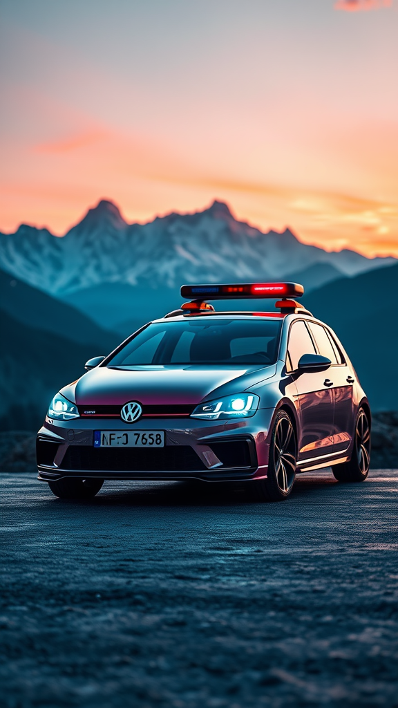 A futuristic VW Golf car transformed into a robotic style with an ambulance emblem glinting under the warm, neon-infused sunlight, set against a majestic mountainous backdrop. The scene captures a panoramic view with metallic textures glistening, showcasing intricate details of the vehicle, all rendered in stunning high resolution, reminiscent of an 8k image. The setting is enhanced with subtle neon accents that highlight the contours of the landscape and vehicle, adding a hint of cybernetic allure to the serene environment.