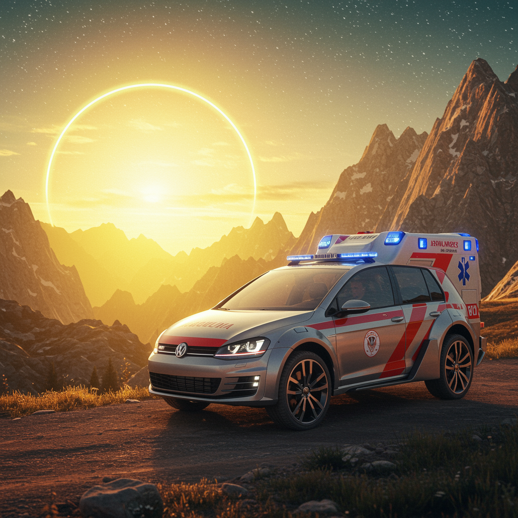 A futuristic VW Golf transformed into a robot-style vehicle, adorned with a prominent ambulance insignia, navigates through a breathtaking mountainous landscape under a radiant neon-lit sky. The scene is bathed in golden sunlight, accentuating the vehicle's sleek metallic exterior and intricate details. This panoramic view captures the essence of advanced technology meeting natural beauty, all rendered in stunning high resolution with an 8k level of detail, creating an immersive and dynamic visual experience. The landscape's vibrant colors and the car's striking design harmoniously blend in this imaginative composition.