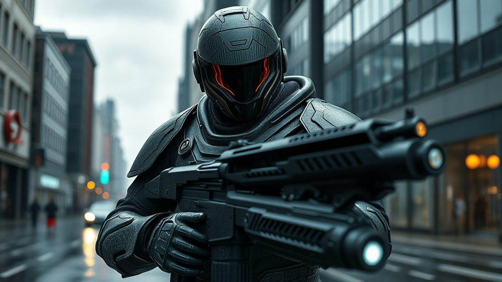 A futuristic warrior clad in sleek, state-of-the-art armor featuring an intricate lattice of dark olive green plates, wielding a cutting-edge energy weapon. The helmet is a marvel of design, seamlessly integrated with augmented reality display visors. Set against a moody, overcast cityscape, the streets glisten with reflections from recent rain, accentuating the hyper-detailed textures. Dramatic, photorealistic lighting captures the contours and sophisticated engineering of the gear. The scene boasts cinematic quality, rendered in 8k for astonishing realism, as if crafted in a high-fidelity virtual engine.