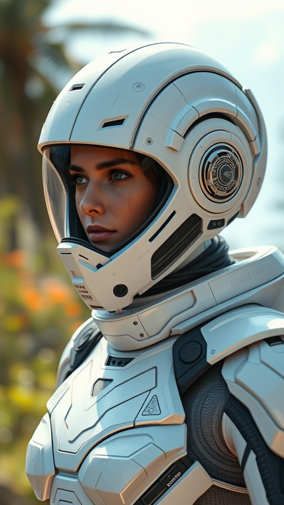 A futuristic white sci-fi female armor featuring a sleek cybernetic helmet, complete with full insulating spacesuit design, detailed with intricate engravings, and fitting perfectly on a bald head. The armor exudes a cinematic sci-fi movie style, captured in an outdoor setting with natural light that highlights the photorealism of the scene. The image is rendered with cinematic quality and ray tracing to ensure the highest detail and quality, viewed from a third-person perspective, capturing the essence of advanced technology in a vibrant natural environment.
