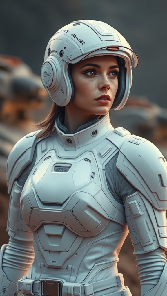 A futuristic white sci-fi female armor set featuring a cybernetic helmet, designed as a full insulated spacesuit. The ensemble includes intricate detailing, characteristic of a sci-fi movie aesthetic, captured in an outdoor setting. The female figure, with a bald head, is depicted in a photorealistic, cinematic third-person view. The atmosphere is created using natural and moody lighting, accentuated with a blur effect and long exposure techniques. The scene is rendered using ray tracing to achieve ultra-HD 8K quality, emphasizing the highest level of detail in both the armor and the surrounding environment.