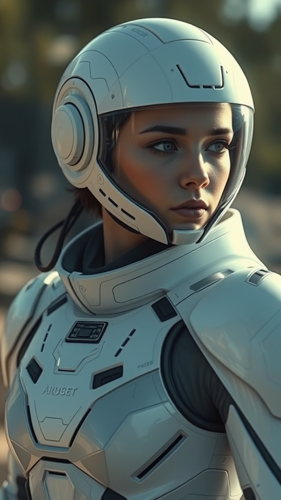 A futuristic white sci-fi female armor with an intricate cybernetic helmet; the armor is full and insulated, resembling a spacesuit. Her bald head accentuates the sleekness of the ensemble, showcasing an abundance of intricate detail. Set in a sci-fi movie style, the scene unfolds in an outdoor environment captured in natural light, enhancing the photorealistic quality. The cinematic rendering employs ray tracing to deliver the highest quality and detail. Presented in a third-person view, the shot captures a blur effect with a long exposure, rendered in 8K Ultra-HD. The lighting is natural yet moody, with a cinematic ambiance that amplifies the futuristic essence of the scene.