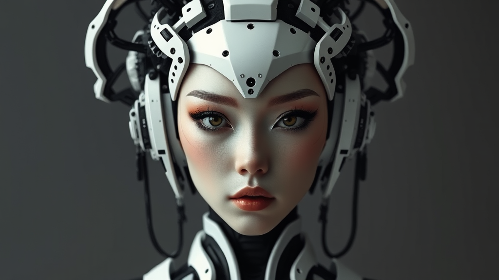 A futuristic woman adorned in intricate robotic headgear, her visage a fusion of dark white and deep black hues, exuding a mysterious aura. Her design is heavily influenced by ancient Chinese art, with elegantly flowing lines and harmony in chaos, juxtaposed against the cutting-edge aesthetic of audio-visual installations. Her form is reminiscent of dada-inspired sculptures, where abstraction meets meaning, grounded in steelpunk's industrial prowess. The overall composition is one of symmetrical precision, evoking a sense of balance and otherworldly beauty. Her presence is an enigmatic blend of past and future, the essence of tradition woven into the fabric of modernity.