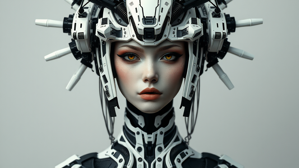A futuristic woman adorned in intricate robotic headgear with a palette of dark whites and deep blacks, reflecting the elegance of ancient Chinese artistry. The composition is imbued with the avant-garde flair of audio-visual installations and dada-inspired sculptures, seamlessly merging with steelpunk aesthetics. The design is symmetrically crafted with an air of mystery and sophistication, invoking a harmonious blend of tradition and innovation.