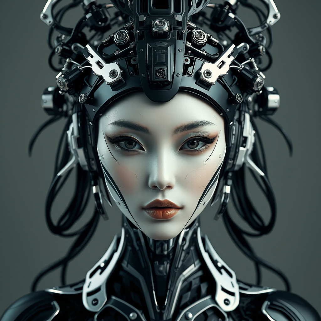 A futuristic woman adorned in intricate robotic headgear, her visage a blend of dark whites and deep blacks, drawing heavily from ancient Chinese art influences. The design weaves in elements reminiscent of audio-visual installations and dada-inspired sculptures, manifesting a steelpunk aesthetic. Her symmetrical form exudes an otherworldly harmony, as metallic textures meet elegant, flowing motifs. The atmosphere is an enigmatic merge of tradition and modernity, evoking a serene yet powerful presence, akin to a living sculpture caught between worlds.