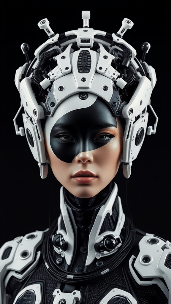 A futuristic woman adorned in intricate robotic headgear, her visage echoing the elegance and complexity of ancient Chinese art. The palette blends dark white and deep black, evoking the contrasting harmony found in yin-yang symbolism. Influenced by the avant-garde aesthetics of dada-inspired sculptures, her attire fuses with steelpunk elements, creating a mesmerizing fusion of past and future. Her symmetrical design is accentuated by flowing lines and angular structures, reminiscent of audio-visual installations, where each component tells a story of innovation and tradition. The composition captures the essence of timeless beauty, wrapped in an enigmatic, high-tech allure.
