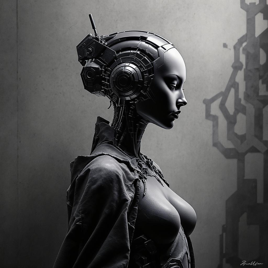 A futuristic woman adorned with sleek robotic headgear stands imposingly, her presence a fusion of dark white and deep black tones that evoke the elegance of ancient Chinese art. Her figure is accentuated by the interplay of shadows and light, reminiscent of avant-garde audio-visual installations. Influences of dada-inspired sculptures can be detected in the abstract geometry of her attire, further enhanced by the industrial textures of steelpunk. The design is marked by a symmetrical balance, with intricate patterns weaving through her attire, suggesting an air of mystery and power. The overall aesthetic merges the ancient and the futuristic, casting a profound and captivating vision.
