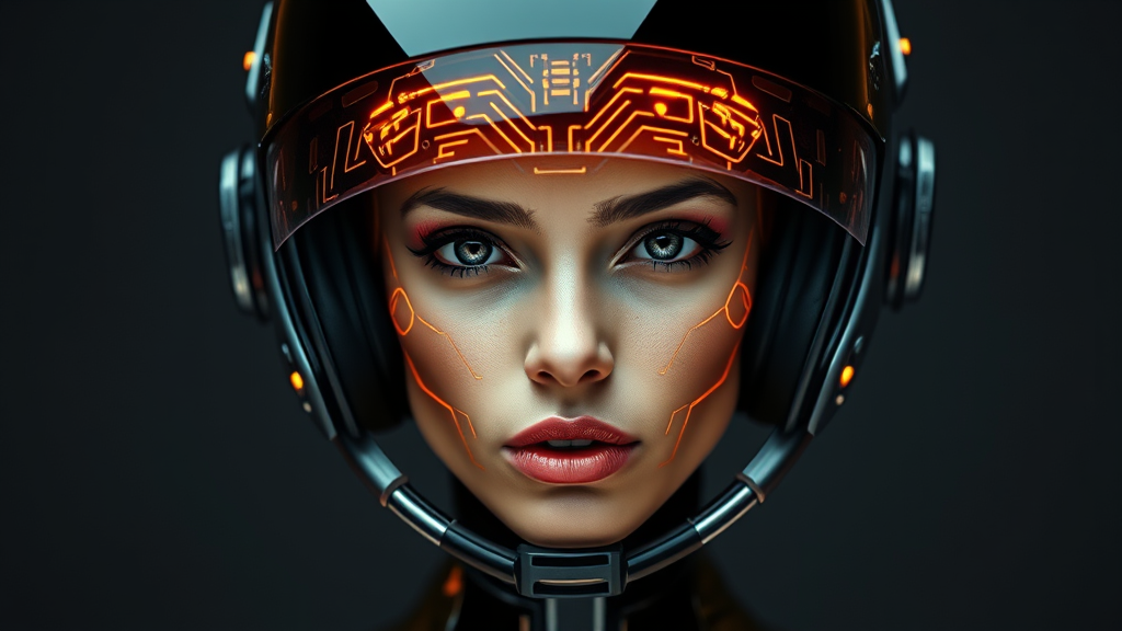 A futuristic woman dons a sleek cyberpunk helmet with metallic robotic accents and glossy black finish, her face illuminated by a network of glowing golden circuits, intricately detailed in their design. Captured in a hyper-realistic, editorial-style photograph, the imagery is presented with an 8k high definition clarity, enhancing her striking pose. Soft neon hues contrast against the geometric patterns on the helmet, accentuating the futuristic theme, while maintaining its photorealistic essence. The portrait is artistically framed with a 9:16 aspect ratio, blending innovation with avant-garde fashion.