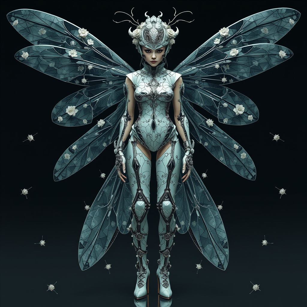 A futuristic woman in a chrome vest, wearing an intricate costume and shoes, depicted in the style of cybernetic surrealism and womancore, with hyper-realistic renderings of the human form composed of intricately detailed insects. The color palette is a mesmerizing mix of dark white and light black, interwoven with elements of flowerpunk aesthetics, creating a sense of otherworldly beauty.