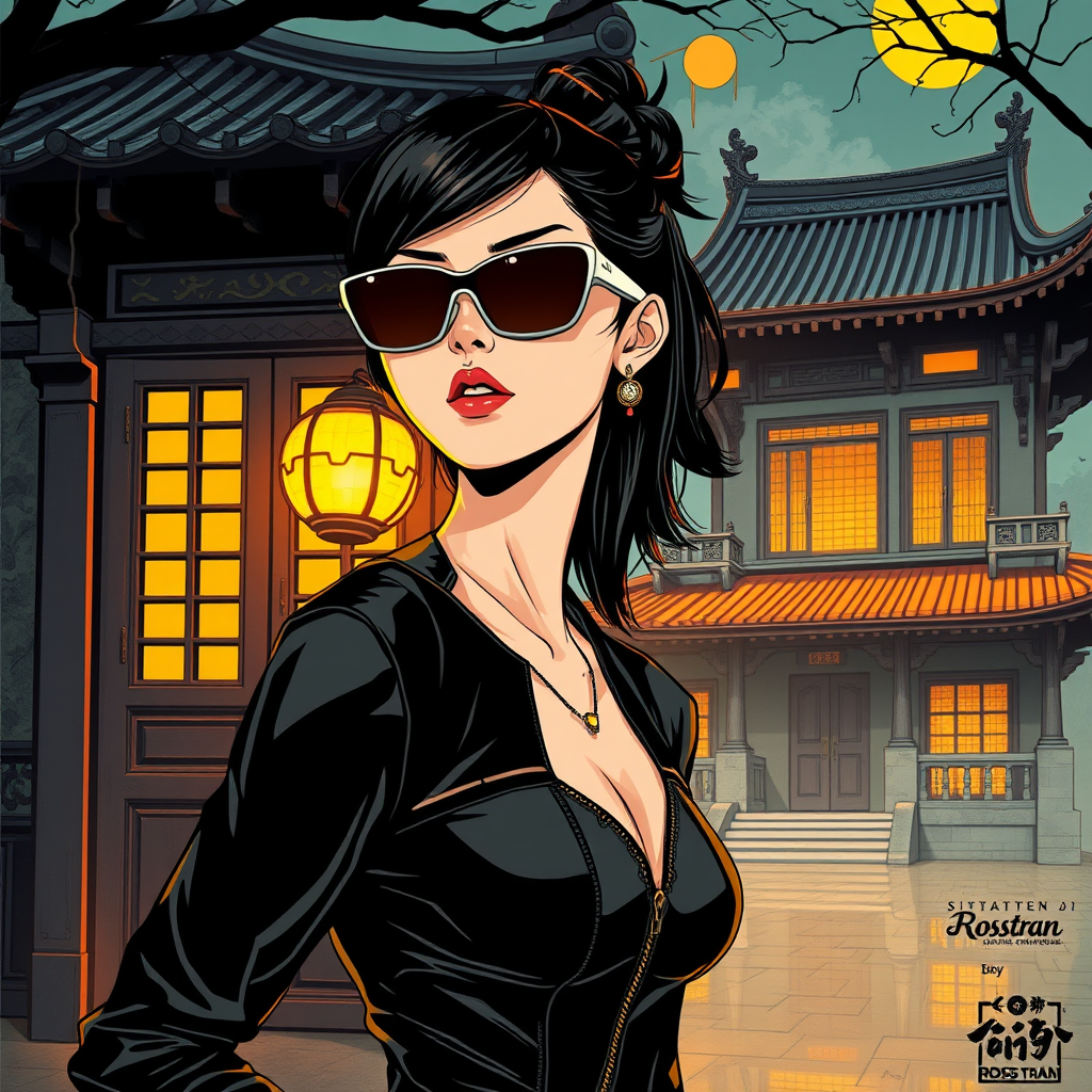 A futuristic woman in sleek sunglasses stands confidently beside a vintage oriental house, capturing the fusion of cyberpunk manga with the dynamic artistry of Ross Tran. The scene is woven with Chinese iconography, rich in the contrast of deep black and luminescent amber hues. Bold graphic illustrations emphasize her presence, drawing inspiration from Chinese tradition, surrounded by multi-layered color fields that tell a story of culture and innovation intertwined.